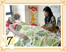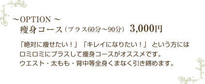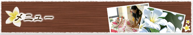 ロミロミマッサージを中心に、オーナーが独自で勉強を重ねた「イギリス式リフレクソロジー」「台湾式足マッサージ」「ボディマッサージ」「指圧」 を融合させて、全身の施術を行います。 当日の体調に合わせたオーダーメイドコース。 状態により多少時間がオーバーすることもございます。 お時間に限りのある方は お申し付けください。 ハワイアンロミロミマッサージ Hawaian LomiLomi massage 120分 9,000円 180分 12,000円 ◎初回限定 120分 8,000円 180分 10,000円 施術の流れ Treatment Flow 腰の歪みをチェックしてから悪い方を下にして横向きになり、内もも・ふくらはぎ・くるぶし・足の裏の施術をします。 横向きのまま肩を施術し、反対を向いて同様に足を施術します。 うつ伏せになり腰のマッサージ ふとももの裏から足首・足の指・足の裏まで施術していきます。 足裏リフレクソロジーの施術をし、ふくらはぎからふとももまでリンパマッサージを施します。 仰向けになり、足をマッサージしていきます。 手の指から二の腕をマッサージします。 デコルテをマッサージ。 再度うつ伏せになり、腰から背中に掛けてマッサージをします。 肩甲骨のマッサージ。 肩から二の腕、手のひらまでマッサージ。 最後に座って肩・背骨・首・頭と施術をしていき終了です。